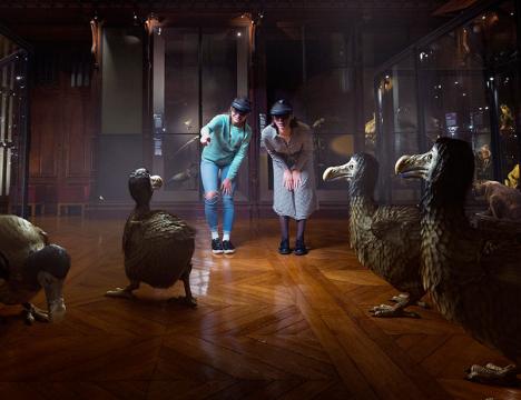 Ces technologies permettent également de « redonner vie » à des espèces animales disparues. La start-up Saola a ainsi créé pour le Muséum national d’histoire naturelle une expérience intitulée « Revivre » [voir ill.] où le visiteur peut voir s’animer devant lui des animaux disparus, comme le dodo ou le tigre de Tasmanie, tout en écoutant l’histoire de ces espèces éteintes : un Compsognathus, un petit dinosaure, gambadait ainsi dans les allées du salon. L’entreprise a également développé pour l’aquarium Nausicaá de Boulogne-sur-Mer, un parcours immersif qui montre des scènes de prédation – comme l’attaque d’une méduse géante par une tortue luth – ou des espèces animales impossibles à trouver dans un bassin, comme le requin-baleine.