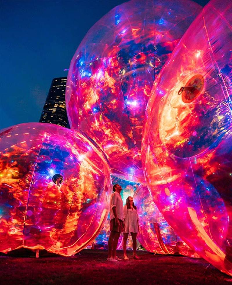De nombreuses sculptures jalonnent le parcours, dont Evanescent, de l’Atelier Sisu (Sydney), une œuvre architecturale qui capte tous les sens, avec sa structure lumineuse et sonore. Sous le ciel étoilé de Metz, les spectateurs peuvent se balader autour et en dessous de l’œuvre qui vise à capturer le concept d’éphémérité et de fragilité sous une forme visuelle : la bulle.