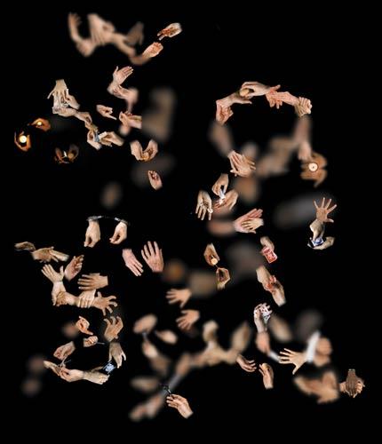 Popularisé sous la forme du jeu domestique, l’usage de la Kinect (1) comme dispositif de reconnaissance du mouvement et de l’image trouve de nombreuses applications auprès des artistes, permettant une interaction immédiate et sensible du spectateur-acteur. La « présence » immédiate est ainsi reprise par la machine dans des propositions aussi différentes que celle d’Arthur Zerktouni avec In Memoriam, qui inscrit à nouveau une forme fantomatique, blanche et lumineuse, silhouette du visiteur ou des visiteurs sur un rideau d’eau. L’identité insaisissable s’efface dans le mouvement infini de la pluie. L’artiste canadien David Rokeby, professeur invité et très remarquable pionnier des recherches en matière d’installations interactives, donne une pièce tout juste mise au point d’une absolue simplicité de présentation : rien qu’une projection vidéo en douche que le spectateur révèle de son corps, de ses mains par exemple, où s’inscrit une image littéralement tridimensionnelle. Car dans Hand-held, l’image (en fait quelque quatre-vingts images en strates horizontales) décrit des gestes simples (un œuf qui tombe d’une paire de mains, par exemple) que le spectateur-écran révèle dans sa continuité spatiale.