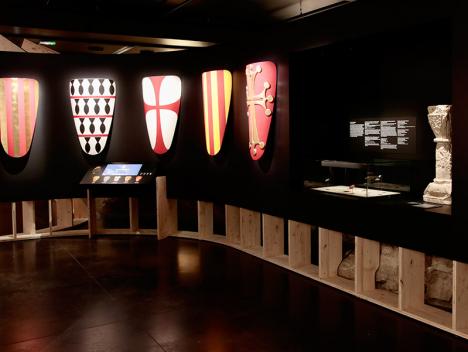 La scénographie du parcours comporte aussi quelques objets du XXIe siècle, costumes ou boucliers créés par des passionnés de reconstitution historique [voir ill.]. « C’est l’inverse du Puy du Fou ! », se défend la directrice du musée, elle-même adepte de la « reconstit’ »à ses heures perdues. Au sein de l’exposition, ces pièces fabriquées selon les techniques et matériaux du XIIe siècle permettent une incarnation appréciable.