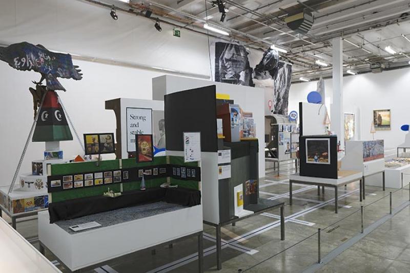 Introduite par quelques œuvres anciennes de Beloufa dont on aurait pu faire l’économie, l’exposition commence par une antichambre consacrée à Gustave Courbet. Figure tutélaire de l’exposition, Courbet renvoie tout à la fois à l’artiste flamboyant faisant un pied de nez au Salon en construisant son Pavillon du réalisme, à l’homme engagé dans la Commune de Paris comme au banni produisant des œuvres commerciales pour rembourser ses dettes. Une mise en perspective historique qui ouvre sur le cœur du projet, un vaste panorama fait de maquettes réalisées exclusivement à partir d’emprunts visuels et textuels reproduits pour l’occasion. Ces maquettes articulent des formes, des discours et des faits ancrés dans des idéologies spécifiques, qu’elles soient politiques, économiques, artistiques ou intellectuelles.