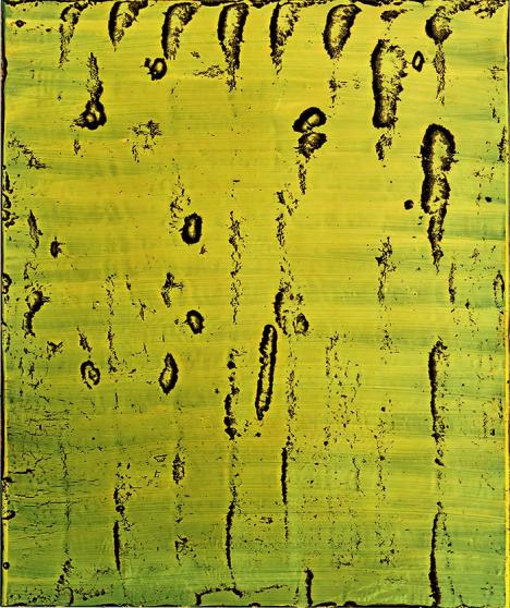 Devant les peintures inédites de l’artiste intitulées Sous-Chromes, on ne le mesure pas au premier abord. Au contraire, les monochromes présentés à La Verrière opposent une belle matérialité et une gamme de couleurs où, souvent par paire, le jaune, le rouge disputent au vert son éclat, mais surtout sa présence pleine et entière. Surface lisse, craquelée ou veinée, rien ne suggère le conflit intérieur qui les travaille. Seul le vécu au fil du temps avec ces peintures permettrait de saisir les métamorphoses progressives induites par les réactions chimiques de la peinture à l’huile sur le goudron, sous l’effet de la lumière, de la chaleur ou du froid.