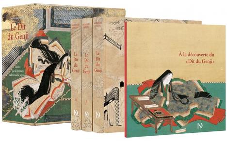 Considéré comme le premier roman psychologique du monde, jalonné de quelque 800 poèmes exprimant les mouvements les plus subtils de l’âme des héros, ce chef-d’œuvre de la littérature japonaise inspire les artistes dès le XIIe siècle. Il donne même naissance à un véritable courant pictural, les genji-e, « images du Genji », où des personnages aux chevelures ondoyantes et aux visages épurés éprouvent l’amour, s’émeuvent, se regardent, rusent et s’affrontent, dans des paysages raffinés aux couleurs chatoyantes. Fruit de sept ans de recherches iconographiques, Le Dit du Genji publié dans un coffret de trois volumes par les Éditions Diane de Selliers, présente en regard du texte quelque 520 œuvres en couleurs du XIIe au XVIIe siècle parmi les plus remarquables (rouleaux, pages d’albums, paravents, kakemonos ou éventails), retrouvées au sein des collections impériales et de monastères japonais, ainsi que de musées internationaux, de fondations et de collections privées du monde entier. L’intégralité des plus anciens fragments de rouleaux du XIIe, classés « trésors nationaux » au Japon, est reproduite au sein de cet ouvrage de référence magnifique. Commentées par Estelle Leggeri-Bauer, directrice du département d’études japonaises à l’Inalco et spécialiste de la peinture narrative japonaise, les œuvres nous ravissent et invitent à se délecter des personnages si délicats de la cour impériale de Heian, à entendre leurs chants, leurs soupirs, leurs cris, dans un monde où la lune, le vent et les montagnes sont omniprésents. Publié en 2008 et distingué par le ministère de la Culture japonais, cet ouvrage en trois volumes est réédité à l’occasion de l’exposition consacrée au Dit du Genji par le Musée Guimet.