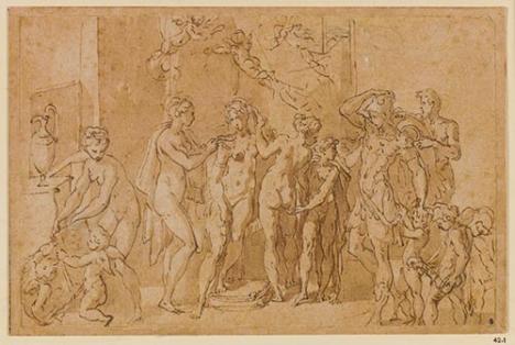 Abonnez-vous dès 1 €Attribué au Parmesan, Les noces d'Alexandre et Roxane, papier collé en plein, plume, encre brune et lavis brun. © Photo : RMN (Musée du Louvre)/Michel Urtado.
