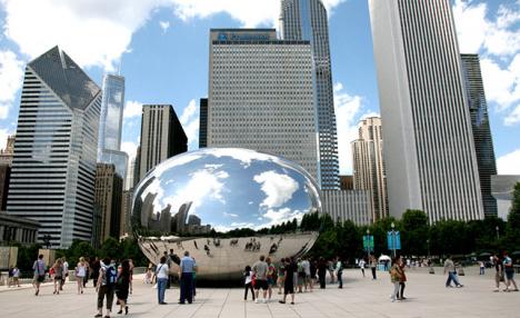 Inauguré le 15 mai 2006, la Cloud Gate que Lori Lightfoot, maire de Chicago, a qualifié de « cœur iconique de la ville » au Chicago Sun Times a été réalisé à l'issu d'un concours de design. Conçue en acier inoxydable, l’installation massive de 10 mètres de haut présente un panorama déformé de la ville grâce à ses propriétés réfléchissantes et sa silhouette courbée.