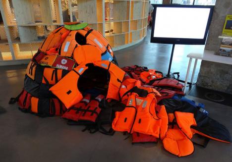 "SOS - Save our souls" est un dôme de plus de 5 mètres de haut, de gilets de sauvetage de toutes les couleurs, oeuvre de l'artiste Achilleas Souras.