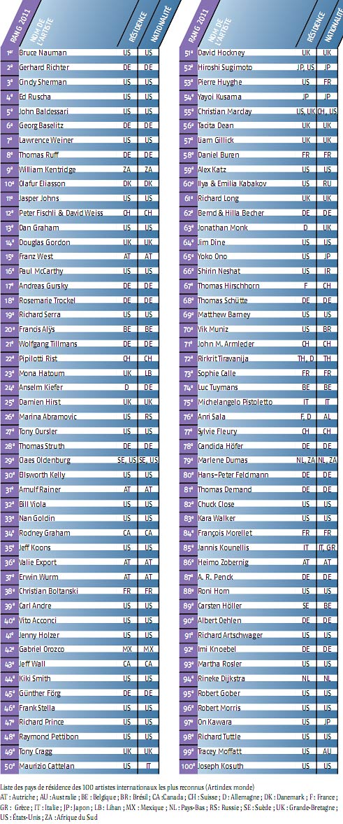 La très grande majorité des 100 plus importants artistes contemporains vivent et travaillent dans leur pays. Les États-Unis restent la scène artistique la plus dynamique.