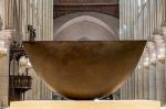 Paris. Comment un lieu de culte et monument célèbre peut-il maintenir l’équilibre entre tradition patrimoniale et ancrage dans la modernité ? Si la restauration du bâtiment s’est faite « à l’identique » de l’état antérieur, le diocèse (affectataire du lieu) et l’archevêque ont souhaité renouveler intégralement le mobilier liturgique, largement détruit dans l’incendie. C’est le designer Guillaume Bardet qui a été choisi à l’été 2023 pour créer l’autel, l’ambon (support de lecture des Évangiles), le baptistère, le tabernacle et la cathèdre (siège réservé à l’archevêque qui marque le statut de cathédrale de l’église). Autant d’objets indispensables à la liturgie qui ne sont pas tous amovibles et participent donc au parcours de visite dans la cathédrale. Celui-ci est légèrement modifié car, dès l’entrée, les visiteurs voient, dans l’axe central de la cathédrale, le baptistère en bronze patiné et à couvercle en miroir poli scintillant [voir ill.] : au bout de cet axe se tient l’autel, massif, en bronze patiné lui aussi. Guillaume Bardet explique avoir choisi des formes « simples » identifiables par des non-chrétiens, comme la coupe (calice) du baptistère qui rappelle « les poteries que l’on trouve dans presque toutes les civilisations ». L’autel [voir ill.] concentre quant à lui le regard au croisement du transept et de la nef ; il est encadré par l’ambon en forme de « T » et la cathèdre inspirée du siège curule romain, positionnés au pied des piliers nord et sud. Le designer insiste sur l’importance de la position du mobilier, qui doit « parler du sacré » aux visiteurs comme aux fidèles, « aux enfants comme aux adultes ». Une patine sombre contraste avec la pierre claire restaurée, qui trouve un écho dans les socles en pierre des pièces du mobilier : Guillaume Bardet estime que ses pièces peuvent être vues comme des « sculptures », et qu’elles doivent conserver « une présence » au-delà de leur statut liturgique.