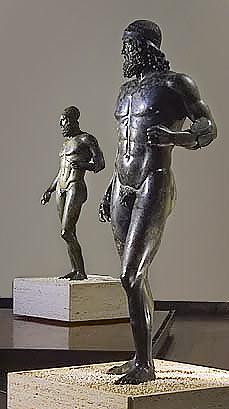 En 1972 ce couple de guerrier en bronze a été trouvé dans la mer Ionienne, au large du village de Riace, en Calabre. D’abord restauré au musée archéologique de Reggio Calabria, la restauration se poursuit entre 1975 et 1980 à Florence. Avant de retourner au musée archéologique de Reggio Calabria, les Bronzes sont exposés à Florence et à Rome et atteignent dès lors une célébrité internationale. Une deuxième restauration est effectuée au musée même entre 1992 et 1995.