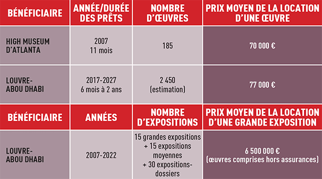 La plus grande opacité règne sur le prix de location des œuvres et des expositions. Le plus souvent, ces prestations ne sont pas présentées sous cet angle. Ainsi, dans l’accord-cadre du Louvre-Abou Dhabi, il est question de « contreparties financières » à des « prêts d’œuvres ».