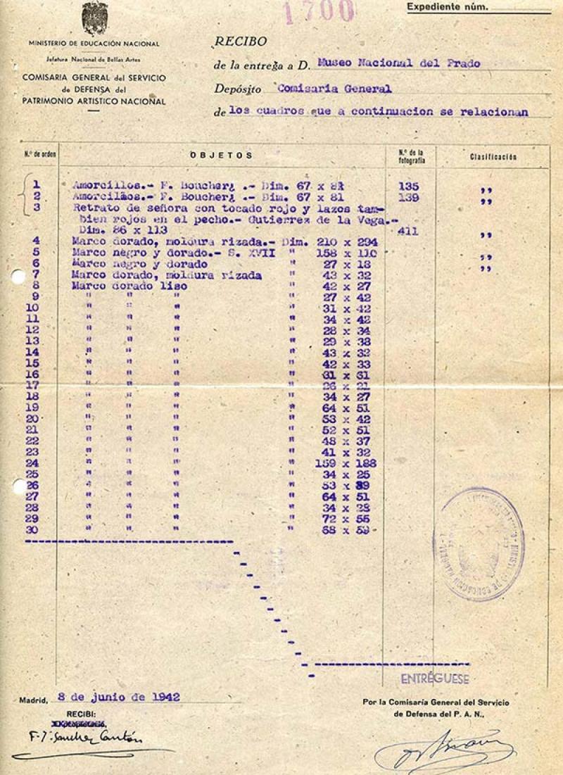 Parmi les soixante-deux œuvres, vingt-cinq ont été saisies après la guerre civile par le Commissariat général au patrimoine artistique national, un organisme créé par Franco en 1938, composé d’un service de défense pour la réparation, la conservation et la reconstruction des œuvres historiques et artistiques, et d’un service de récupération pour la restitution des biens historiques et artistiques, dissous en 1943. Trente-sept autres ont été déposées au musée entre 1940 et 1942 par le Service de défense du patrimoine artistique national (SDPAN), également créé par Franco. Des toiles de François Boucher, de Brueghel le Jeune ou de l’impressionniste espagnol Joaquín Sorolla (1863-1923) en font partie.