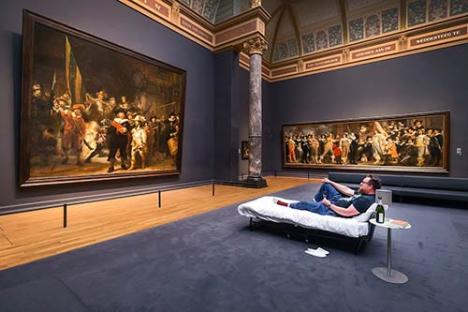 AMSTERDAM (PAYS-BAS) [02.06.17] - Un Néerlandais a dormi dans la pièce où est exposé le célèbre tableau de Rembrandt La Ronde de nuit, une expérience inédite que le Rijksmuseum d'Amsterdam avait offerte jeudi à ce 10 millionième visiteur depuis la réouverture du musée en 2013.