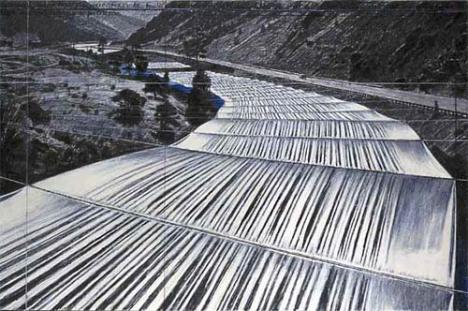 Abonnez-vous dès 1 €Christo, Over The River, projet pour la rivière de l'Arkansas, Colorado, oeuvre sur papier, 2006, 38 x 165 cm - Photo Wolfgang Volz © Christo / www.overtheriverinfo.com