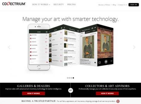 Moyennant un paiement entre 45 et 395 dollars mensuels, Collectrium offre aux collectionneurs, marchands, galeristes et conseillers en art la possibilité de numériser et d’inventorier leurs œuvres afin de gérer leur collection en ligne, données financières à l’appui. Du point de vue des collectionneurs, l’outil numérique intègre tous les services qu’implique la gestion d’une collection : cataloging, conservation, mise en valeur, recherches de marché, estimation / évaluation, stockage, logistique, acquisitions et ventes, financement, assurances. La plateforme serait actuellement utilisée par 25 000 collectionneurs et référencerait plus d’un million d’œuvres.