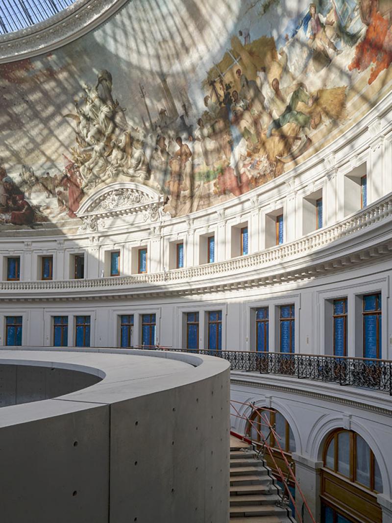 Une des plus grandes fresques peintes, en toile marouflée, de 1.400 mètres de long, panorama circulaire qui décrit de manière idéalisée le commerce entre les continents, a été restaurée. Trois univers s'allient dans ce décor de blancheur : en haut, les cieux changeants à travers la verrière ; au milieu, la peinture colorée et surchargée de personnages et de symboles du XIXe siècle; et en bas, le dépouillement du béton qui mettra en valeur un art contemporain volontiers minimaliste.
