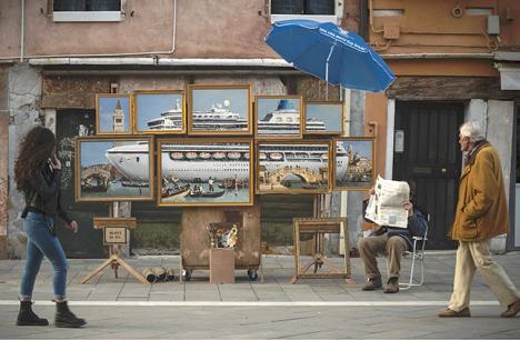 Dans une vidéo postée sur son compte Instagram, l'artiste célèbre pour ses pochoirs satiriques ou subversifs, s'est glissé dans le manteau, et sous le chapeau, d'un peintre ambulant installant tréteaux et chevalet sur le quai d'un canal vénitien, sous l'oeil intrigué des badauds et des touristes. Peu à peu, l'inconnu dévoile une série de neufs toiles qui, une fois réunies, représente un paquebot qui se fraye un passage au milieu de gondoles rappelant un Canaletto... Un anachronisme baptisé Venice in oil (Venise dans l'huile) qui semble vouloir dénoncer le tourisme de masse et les navires géants qui envahissent la Sérénissime.