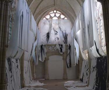 Coutumier d’interventions picturales dans des espaces architecturaux, l’artiste a en effet conçu pour la chapelle un projet magistral, fondé sur la réinterprétation d’une tradition de tapis suspendus issue des arts décoratifs. Après avoir revêtu l’intérieur de l’édifice de larges bandes de fine moquette blanche, recouvrant la totalité des baies vitrées et se répandant au sol, Calais a pris à bras-le-corps le support panoramique qui s’offrait ainsi à lui. Au pinceau, au couteau, à la brosse, à la serpillière ou à mains nues, il a peint in situ, usant du noir pour distribuer çà et là motifs, traits, tâches et coulures dans une abstraction gestuelle revisitée, tirant parti au passage de la lumière colorée qui émane naturellement des vitraux. Où quand la peinture accueille l’architecture.