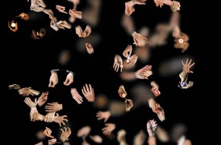 Popularisé sous la forme du jeu domestique, l’usage de la Kinect (1) comme dispositif de reconnaissance du mouvement et de l’image trouve de nombreuses applications auprès des artistes, permettant une interaction immédiate et sensible du spectateur-acteur. La « présence » immédiate est ainsi reprise par la machine dans des propositions aussi différentes que celle d’Arthur Zerktouni avec In Memoriam, qui inscrit à nouveau une forme fantomatique, blanche et lumineuse, silhouette du visiteur ou des visiteurs sur un rideau d’eau. L’identité insaisissable s’efface dans le mouvement infini de la pluie. L’artiste canadien David Rokeby, professeur invité et très remarquable pionnier des recherches en matière d’installations interactives, donne une pièce tout juste mise au point d’une absolue simplicité de présentation : rien qu’une projection vidéo en douche que le spectateur révèle de son corps, de ses mains par exemple, où s’inscrit une image littéralement tridimensionnelle. Car dans Hand-held, l’image (en fait quelque quatre-vingts images en strates horizontales) décrit des gestes simples (un œuf qui tombe d’une paire de mains, par exemple) que le spectateur-écran révèle dans sa continuité spatiale.