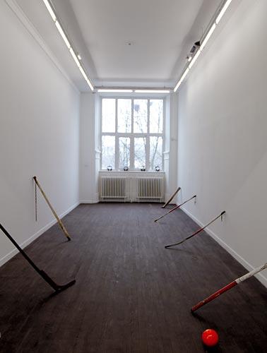 À Altkirch, point de visée programmatique, l’exposition s’attache avant tout à différencier les modes de collaboration possibles entre artistes. Quelques axes peuvent être dégagés à partir des vidéos « historiques » présentées dans sa première salle. Le premier concerne les couples d’artistes, à l’instar de Peter Fischli et David Weiss, dont est programmé Le Droit Chemin (1983), pérégrination burlesque des deux protagonistes déguisés en ours à travers un paysage mi-glaciaire mi-lunaire. Plus loin, Michel Dector et Michel Dupuy, qui se livrent quant à eux à des déambulations dans les villes, exposent les Barres d’empêchement de se garer (2010) qu’ils ont rapportées d’une visite de Nancy. Émus par « leur aspect plastique, leur présence à la fois incongrue et déterminée » dans l’espace de la rue, ils sont parvenus à gagner la confiance des habitants afin de les obtenir en échange de copies. Pour ces artistes qui font œuvre commune depuis vingt ans, comme pour Fischli et Weiss, la question du dialogue entre l’un et l’autre ne se pose pas, les deux n’ayant jamais formé qu’un aux yeux du public. De même pour Yvan Clédat et Coco Petitpierre, qui vivent et travaillent ensemble depuis leur rencontre, mais aussi pour le collectif Mahony, dont la pièce Los Tres Invitados (2010) mêle photographies de sculptures, vidéo et dessins. Ici encore s’opère la fusion de la participation, sous un seul nom, des trois membres du groupe.