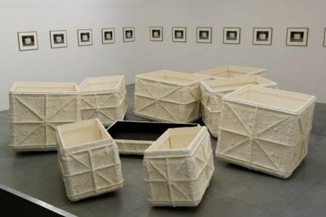 Le principe de contradiction dialectique joue encore dans le choix fait par l’artiste de présenter dans l’autre salle, située à une volée de marches en contrebas, non des formes érigées mais de ses mystérieux moules retournés (comme on retourne un gant) aux formes de socle classique. Moules disposés basculés, vides et offerts au regard, en équilibre visuellement instable, composant au centre de la salle une sorte de sarabande. Et bien sûr, c’est la forme de leur vide qui, avec leur titre (Monument à Victor Hugo [1998] ou Cariatide [1996 et 1997]), les rattache à l’histoire de l’art, donnant presque à toucher (la tentation tactile est présente dans tout le parcours) les monuments absents.