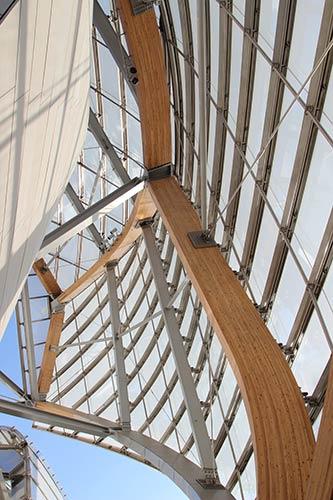 Les douze voiles de verre, chacune de forme et de courbure différentes, sont composées de plus de 3.800 panneaux sérigraphiés. Détachées du coeur du bâtiment - "l'iceberg", selon la formule de l'architecte -, elles sont soutenues par un jeu sophistiqué de poutres en acier et en bois.