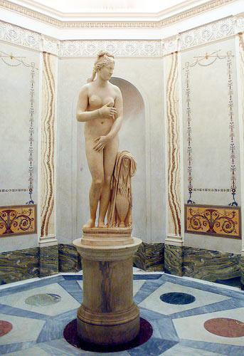 Or, la Vénus Capitoline, encore appelée Vénus Pudica, représente la déesse dans son plus simple appareil, tentant avec stupeur de dissimuler les attributs de sa féminité. Datable vers 330 avant Jésus-Christ, cette statue avait été découverte intacte et ensevelie dans les années 1670, au sein d’un jardin romain. Elle avait alors été donnée par le pape aux musées du Capitole. Mais, à l’origine, la Vénus Capitoline avait été créée pour un particulier romain, qui souhaitait posséder sa version personnelle du chef-d’œuvre grec conçu par Praxitèle, l’Aphrodite de Cnil.