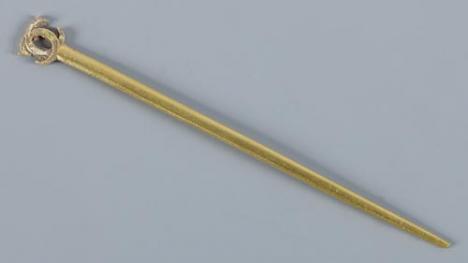 Abonnez-vous dès 1 €Épingle à cheveux en or surmontée de deux C entrelacés émaillés de blanc et de vert - Longueur : 10 cm - © Photo Yvan Bourhis-CG77