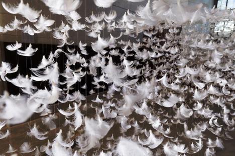 Au rayon découvertes, bonne pioche a été faite cette année avec Isa Barbier et Sophie Lavaux. Dans l’office du château, la première a suspendu à des fils quasi imperceptibles quelque 6 500 plumes d’oie et de goéland qui frémissent au moindre courant d’air pour dessiner dans l’espace de légères ondulations. Entre faisceau de virgules, vaisseau fantôme et conte de fées. Sophie Lavaux, elle, a installé dans les tours de Diane et du Roi des sortes de couronnes en porcelaine blanche, comme des coraux, qu’elle a disposées sur des miroirs pour conjuguer formes naturelles et reflets d’architecture.