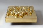 Pol Bury, 25 oeufs sur un plateau, 1970, laiton poli, moteur, aimants, 50 x 50 x 20 cm, collection particulière.