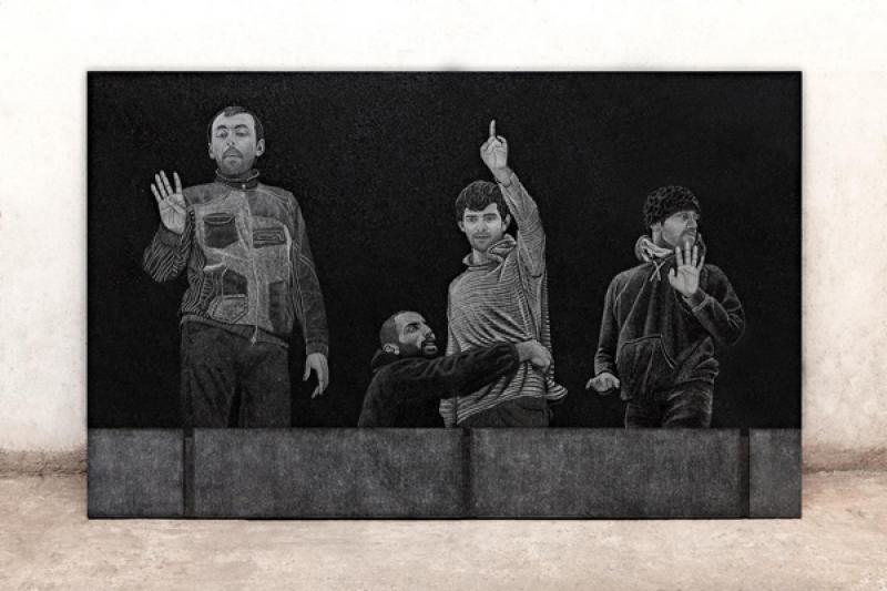 Cet « autre » anonyme, qui n’existe en tant que tel que pour renforcer l’exclusivité du regard dominant, revient en majesté dans l’exposition à travers la figure du migrant. Clarisse Hahn transfère en gravure sur marbre une image trouvée dans la presse locale de quatre jeunes hommes à Calais. Intitulée Aux aventuriers (2017), l’œuvre marque par la solennité de leur gestuelle, main levée vers le ciel en signe de victoire ou paumes ouvertes empruntées au Christ Pantocrator. En vis-à-vis de ce qui pourrait aussi être la pierre tombale de ceux qui sont restés sur la route, l’artiste présente des photographies de sa série « NATÜR » (2018). Des corps masculins tatoués y sont photographiés en plan américain sans tête, portant des livres ouverts. On croise une bible des témoins de Jehovah amérindienne illustrée par un paradis d’hommes blancs, un ouvrage de gymnastique nazie et ses corps idéalisés ou des images de la peuplade philippine Tasaday, une supercherie ethnographique. Dans tous les cas, il s’agit de visions d’un état de nature fantasmé que ces corps métaphoriques transportent au sens étymologique du terme en tenant ces ouvrages. La nature rejoint l’usine comme projection utopique, image d’un lieu que l’on ne peut pas atteindre, sauf à y replacer en son centre le corps activiste. C’est ce que montre le film Notre corps est une arme, los Desnudos (2012). Clarisse Hahn y filme des femmes mexicaines défilant nues, et parvenant à attirer l’attention sur elles dans leur lutte pour récupérer des terres volées : la terre n’est pas un lieu utopique et le corps est son espace politique.