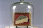 René Magritte, Ceci est un morceau de fromage, 1936 - vers 1963-1964, huile sur Masonite, cadre de bois doré sur chevalet en miniature, plateau à fromage et cloche en verre, 30,5 cm, collection particulière, Londres.