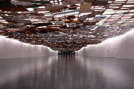 La force de l’installation réside dans sa capacité à jouer sur les contrastes : entre assemblage et destruction, entre réunion et fragmentation, entre chaos et parfait ajustement, entre sublime et tragique. Lourd et flottant à la fois, ce plafond suspendu qui permet la traversée du regard, est à l’image de « l’anéantissement et du ciel perçus par les victimes » décrits par la commissaire, Hélène Guenin.