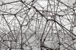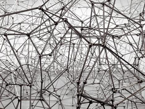 Comme à son habitude, Béatrice Josse, chef d’orchestre du Frac, n’illustre pas, elle induit. Elle concocte des cadres, des atmosphères à l’aide des œuvres, déniche des petites merveilles comme cette installation du jeune Pierre-Étienne Morelle, Grow, une bande de chambres à air mises bout à bout. Ces dix kilomètres sont alors roulés en boule. Une nouvelle planète entourée de chutes, objet non identifié et sombre, cette masse souligne son geste dérisoire et son rapport désormais atrophié au voyage. Elle fait écho à l’autre œuvre majeure du parcours en neuf artistes, Firmament III d’Antony Gormley, invasion arachnéenne d’une salle. Saturation visuelle de filins d’acier, l’installation laisse finalement le visiteur pénétrer sa matière comme un voyage dans un espace-temps parallèle, une dimension incertaine, certainement bien au-delà de la quatrième. Une invitation au songe ou à l’anticipation, c’est selon ses envies.