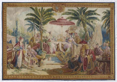 Réunion inédite depuis le XVIIIe siècle, la suite complète des six tapisseries de la « Tenture chinoise », venues de France et du Palazzo Reale de Turin, est présentée en regard des esquisses de Besançon. Ce sont en réalité des compositions européanisées à partir de motifs chinois, à l’image de ce que peint Antoine Watteau vers 1710 au château de la Muette pour la famille d’Armenonville. Là encore, une réunion exceptionnelle de deux peintures de Watteau, réapparues en 1996 et 2009 et conservées en collection particulière à New York, illustre le décor à la chinoise exécuté par Watteau pour l’intérieur du château. Un décor gravé vingt ans plus tard par Boucher qui a sans nul doute influencé la manière dont le même transcrit les motifs chinois dans la peinture française, évitant tout effet grotesque.