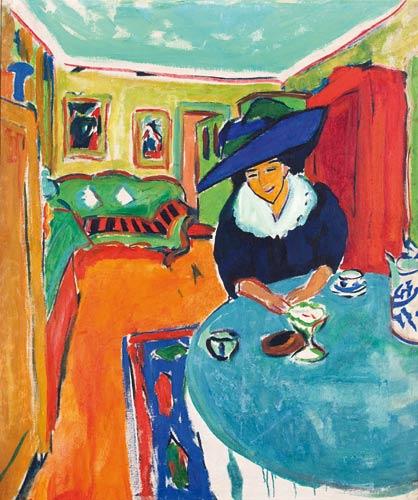 La comparaison proposée permet de constater que les fauves, comme les expressionnistes, prennent des libertés avec la réalité, et la déforment, mais aussi qu’ils usent de couleurs arbitraires et dissonantes. Quelques œuvres splendides (en particulier un tableau de Kirchner, Dodo à table, 1909) nous en convainquent. Il est toutefois regrettable que l’accrochage n’insiste pas sur la distinction thématique entre ces deux groupes. Pour les fauves, engagés dans une démarche formelle, le sujet semble avant tout être un prétexte à des recherches picturales. Les membres de Die Brücke visent l’homme dans le processus de détérioration de ses rapports avec le monde extérieur. En revanche, l’exposition met en évidence les gravures et les nombreux documents qui accompagnent les artistes allemands, permettant ainsi de mieux comprendre leurs circuits (marchands, critiques). Le parcours se poursuit avec un groupe véritablement international : le Blaue Reiter. Sous l’impulsion de Vassili Kandinsky et Franz Marc, on assiste au rassemblement de toutes les personnalités de l’avant-garde européenne. Les belles toiles de Kandinsky et Jawlensky, Marc ou Macke permettent de saisir toute l’importance de ce groupe phare, un des lieux de passage vers l’abstraction.
