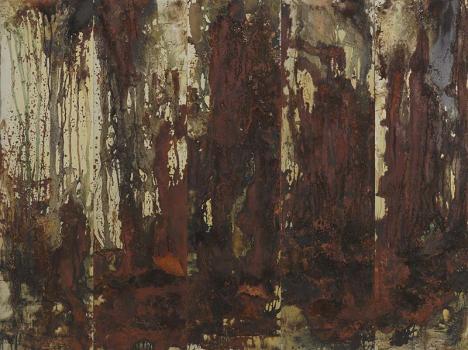 Les cinq autres salles déploient tout un éventail de techniques – sculpture, dessin, peinture, installation – et de matériaux qu’utilise Lionel Sabatté. À ceux déjà évoqués, s’ajoute en effet trois grands et magnifiques triptyques, fruits de l’attaque maîtrisée de différents oxydes sur des plaques de métal. Le résultat fusionne à la fois d’étonnants effets de matière (comme un magma), une richesse chromatique (du marron au jaune en passant par des turquoises) et des évocations de paysages entre la terre vue du ciel et Claude Monet dans un sous-bois ou en plongée sous-marine. Dans une salle suivante, d’étranges sculptures totémiques en bronze, entre branches verticales et stalagmites à la surface ébarbée, sont surmontées d’une forme qui évoque des oiseaux – ce que confirme le titre Champ d’oiseaux. Certains d’entre eux ont quitté leur branche pour aller s’accrocher directement sur les murs auréolés d’un halo de lumière qui donne à l’ensemble une tension et une suspension hitchcockiennes.