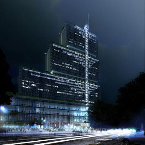 Palais de justice, vue de la façade Est la nuit depuis le parvis, Paris, 2010, architecte : RPBW. © RPBW – Renzo Piano Building Workshop Architects, render by Labtop.