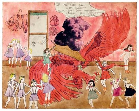 Henry Darger, à Mc Calls Run Coller Junction une Vivian Girl sauve des enfants étranglés par un phénomène de forme effroyable, reports au papier carbone, crayon graphite, aquarelle, gouache et collages sur papier vélin, 48 x 61 cm, Musée d'Art moderne de la Ville de Paris, Paris. © 2015 Kiyoko Lerner. Photo : Eric Emo/Musée d'Art Moderne/Roger-Viollet.