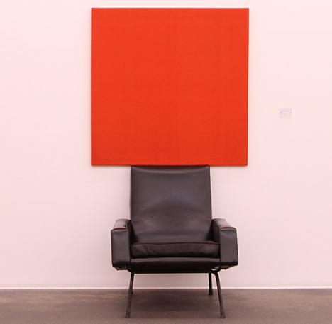 Charge-Objet de Jean-Michel Sanejouand : Fauteuil et carré de toile rouge (1966), coll. Frac Ile-de-France, présenté dans l'exposition au Mamco à Genève © Photo L.S.