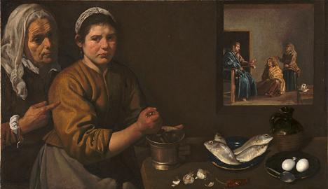 L’exposition s’ouvre par une très belle toile de Juan Sánchez Cotán, Nature morte avec coing, chou, melon et concombre (1602), un des maîtres principaux de ce genre. À la différence des œuvres hollandaises et flamandes, souvent très « bavardes », la peinture se distingue par son côté très sobre et dépouillé. Alignés au premier plan, traités selon une architecture rigoureuse qui leur donne une allure monumentale et établit une distance avec le spectateur, ces fruits et légumes, qui font tous partie d’un univers quotidien, forment une scène théâtrale. Puis c’est le chef-d’œuvre de Vélasquez, Le Christ dans la maison de Marthe et Marie (1618). La composition de cette toile, due à un artiste qui ne pratique que peu la nature morte, est étonnante par le renversement inhabituel des plans entre le sacré et le profane. De fait, les poissons et autres victuailles, que l’on remarque immédiatement, guident le spectateur vers la scène principale située au fond du tableau. On reste en revanche sur sa faim – c’est le cas de le dire – avec Francisco de Zurbarán, sous-représenté ici. Les quelques fleurs de La Vierge enfant endormie (1665) sont loin de la rigueur presque archaïsante avec laquelle sont placés les tasses, les vases et les plateaux dans d’autres toiles du peintre, annonçant déjà un Morandi. Faut-il se consoler avec cette curiosité, une toile avoisinante plutôt séduisante, de Juan de Zurbarán, le fils, Nature morte avec panier en osier et pommes (1643) ?
