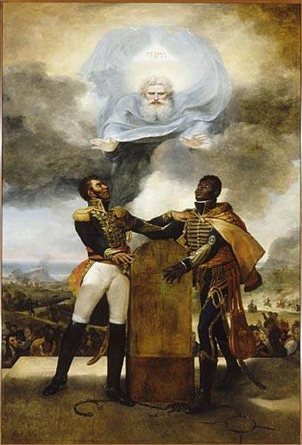 Le tableau peint par Guillaume Guillon-Lethière (1760-1830), artiste originaire de Guadeloupe d’un père colon et d’une mère esclave représente la rencontre historique entre le chef des mulâtres de Saint-Domingue, Alexandre Pétion, et le général noir Jean-Jacques Dessalines, lieutenant de Toussaint Louverture. Ce serment scellé en novembre 1802 « marqua le début du processus qui mena l’indépendance d’Haïti en 1804 » précise le communiqué du ministère.
