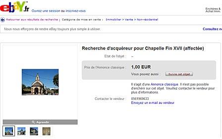 TOULOUSE [25.08.09] – Cherchant à soustraire de l’évêché la chapelle de l’Aisle, inutilisée depuis 2005, le maire de Massat met en vente sur eBay le bâtiment au prix d’un euro.