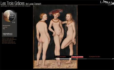 Le musée du Louvre lance un appel inédit aux donateurs individuels pour acheter un tableau de Lucas Cranach, Les Trois Grâces. Le musée a créé un site internet sur lequel les donateurs peuvent effectuer un don et découvrir le tableau. Il s’agit d’un petit tableau (24 centimètres sur 37) peint par le maître allemand de la Renaissance en 1531. Vu sa dimension et sa composition, il était apparemment destiné à un amateur et n’aurait jamais été exposé au public. Henri Loyrette, le président directeur du musée du Louvre, explique que le tableau a été décrété « trésor national » grâce à « sa grande rareté et son remarquable état de conservation ». Le propriétaire actuel l’a mis en vente pour quatre millions d’euros ; le musée aurait déjà récolté les trois quarts de la somme.