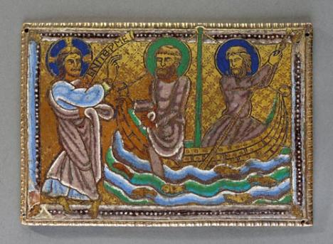 Abonnez-vous dès 1 €Exceptionnelle plaque en cuivre champlevé, émaillé, gravé et doré représentant la Vocation de Pierre et André - Angleterre, vers 1170-1180 - H. 8,6 cm - L. 12,4 cm. Estimation 150 000 / 200 000 euros - Vente du 27 mai 21013 - SVV de Baecque - Source www.debaecque.auction.fr
