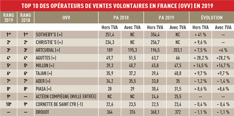 Avec un chiffre d’affaires cumulé de plus de un milliard d’euros, les dix premiers opérateurs affichent une hausse de 20 % par rapport à 2018. Sotheby’s est en tête.