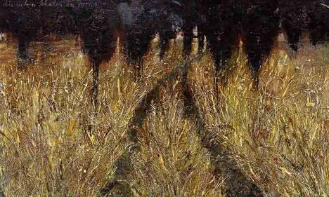On a d’ailleurs souvent dit d’Anselm Kiefer qu’il ne faisait pas dans la dentelle, mais là ce sont carrément des haches et des faucilles qu’il vient coller à la surface de ces tableaux-paysages. Ceux-ci évoquent des champs et des chemins quasiment à l’échelle humaine et donnent au visiteur l’impression de pouvoir les emprunter et de rentrer dans les tableaux, et ce d’autant plus qu’ils sont volontairement accrochés assez bas.