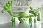 Les marchands unissent également parfois leurs forces pour produire certaines des œuvres présentées dans le programme public, en libre accès et déployé dans la ville. Ainsi, sur le parvis de l’Institut de France, la sculpture monumentale d’Ugo Rondinone requiert la collaboration des galeries Eva Presenhuber (Zurich, Vienne), Gladstone (New York, Bruxelles, Séoul) et Mennour (Paris). D’autres font le pari de marquer le coup dans l’espace public, telle Sadies Cole HQ (Londres), absente du Grand Palais mais qui accompagne place Vendôme l’artiste vénézuélien-américain Alex Da Corte et sa baudruche géante vert grenouille Kermit the Frog, Even (2018, [voir ill.]) à moitié dégonflée, comme le symbole de l’effondrement d’une époque.