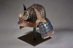 Ce casque en fer naturel (voir illustration ci-dessus), comportant 16 plaques de forme koshozan, possède un bol orné de wakidate (ornements latéraux) en cuivre doré dont la forme évoque la représentation stylisée des ailes d’une oie. Il porte un maedate (ornement frontal) propre à la province de Kaga. Son armoirie, de type katabami (oxalis), était utilisée par plusieurs familles de daimyô. Rattaché à l’école Kojima (branche des Myochin de Kaga fondée par Munehide dans le dernier quart du XVIIIe), le travail de forge et la qualité de la patine du casque évoquent le travail de Munetaka, le second maître de l’école.