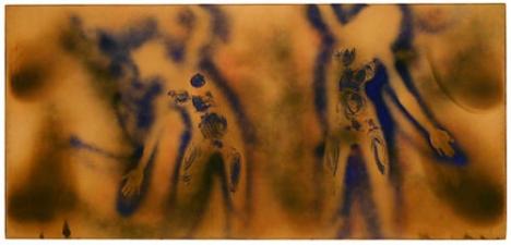 Yves Klein, foudroyé par une crise cardiaque en juin 1962 à 34 ans, avait conçu FC1 en mars ou avril de la même année. Réalisée au Centre d’essai de Gaz de France, la performance avait été filmée : les deux jeunes modèles féminins sont aspergés d’eau avant de se plaquer contre un grand panneau (1,4 x 3 mètres) ignifugé ; Yves Klein utilise ensuite un lance-flammes pour faire apparaître les silhouettes ; puis, enduits de peinture bleu Klein, les modèles se collent à nouveau contre la réalisation et l’artiste accentue les contours de leurs corps en vaporisant de la peinture. L’œuvre rousse et bleu Klein représente alors deux silhouettes qui semblent esquisser des mouvements de danse dans une vision onirique.