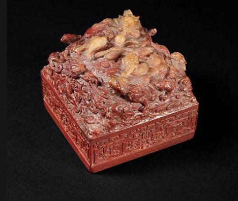 Il y a ensuite la qualité de la stéatite (pierre à savon), une des pierres les plus précieuses à cette époque pour les cachets. Provenant de la ville de Shou Shan dans la province du Fujian (sud-est de la Chine), celle de l'exemplaire vendu à Paris est "très rouge, presque « sang de poulet »", souligne Alice Jossaume. Autre caractéristique remarquable: la "finesse extraordinaire" de la sculpture. Le cachet est décoré sur quatre côtés de dragons stylisés et archaïques et surmonté de neuf dragons qui "pourchassent la perle sacrée, symbole du pouvoir impérial et de l'immortalité". Le nombre neuf est associé au pouvoir masculin et le dragon symbolise l'autorité impériale. Enfin, le sceau comporte, au revers, l'inscription en écriture ancienne utilisé pour les cachets (Zhuanshu) la mention "Trésor du pinceau impérial de Qian Long" (Qian Long Yu Bi Zhi). Cet empereur était en effet un poète et un calligraphe de talent, et ce sceau l'un de ceux qu'il utilisait pour signer ses oeuvres.